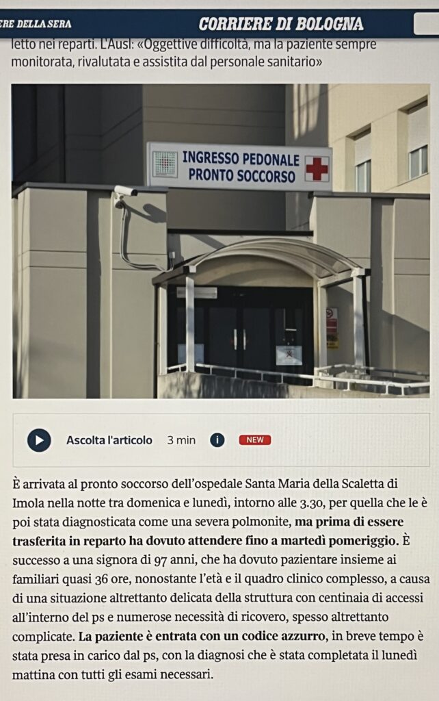 Si apprende dal Corriere di Bologna che una donna di novantasette anni è stata fatta attendere trentasei ore prima di venire ricoverata a causa di una severa polmonite.